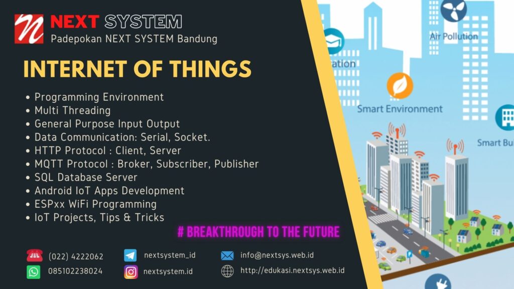 Yuk, bergabung dengan Padepokan NEXT SYSTEM Bandung dan pelajari bagaimana menghubungkan dunia fisik dengan dunia digital melalui jaringan yang cerdas. Dalam program pelatihan kami, Anda akan memperoleh pemahaman mendalam tentang konsep IoT (termasuk rancangan bangun sisi client dan server), teknologi terkait, dan aplikasinya dalam berbagai industri. Dengan bimbingan instruktur berpengalaman dan lingkungan belajar yang interaktif, Anda akan mempelajari cara merancang, mengembangkan, dan mengimplementasikan solusi IoT yang inovatif.